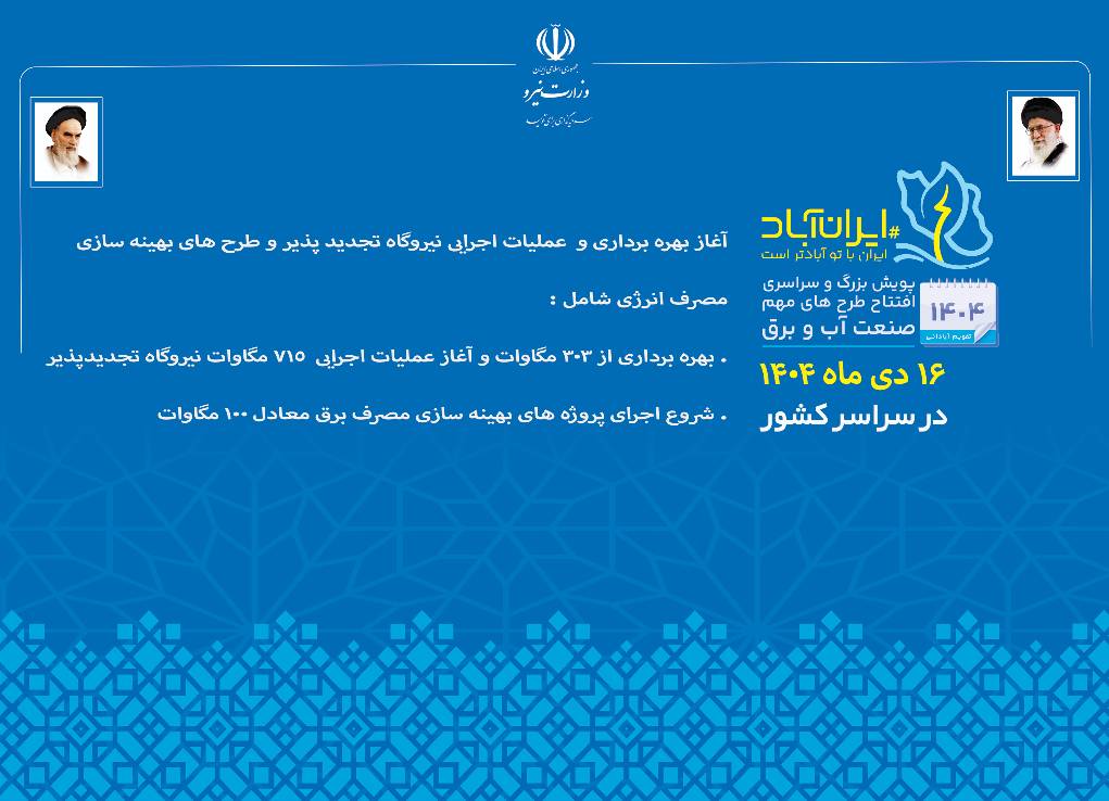 ️به گزارش روابط عمومی شرکت توزیع نیروی برق استان تهران، آیین آغاز بهره‌برداری و عملیات اجرایی بیش از ۱۲۶۹ مگاوات نیروگاه تجدیدپذیر و طرح‌های بهینه‌سازی مصرف برق در سراسر کشور، با حضور وزیر نیرو، مقامات ارشد صنعت برق، استاندار تهران و رئیس مجمع نمایندگان استان تهران در مجلس شورای اسلامی، روز سه‌شنبه ۱۶ دی ۱۴۰۴ در محل شرکت توزیع نیروی برق استان تهران برگزار خواهد شد.️در این مراسم، طرح‌هایی در استان‌های تهران، مرکزی، اصفهان، قم و قزوین به صورت ویدئوکنفرانسی به بهره‌برداری رسیده و یا عملیات اجرایی آنها آغاز می‌شود. این پروژه‌ها در حوزه توسعه انرژی‌های تجدیدپذیر و بهینه‌سازی مصرف انرژی، با سرمایه‌گذاری بالغ بر ۳۳ هزار میلیارد تومان تعریف شده‌اند.️همچنین در حاشیه این مراسم، طرح ملی بهینه‌سازی مصرف انرژی در شبکه روشنایی معابر استان تهران از طریق جایگزینی چراغ‌های پرمصرف گازی با چراغ‌های کم‌مصرف LED به طور رسمی آغاز خواهد شد؛ طرحی که نقش مؤثری در کاهش مصرف برق، ارتقای ایمنی شهری و بهبود کیفیت روشنایی معابر ایفا می‌کند.