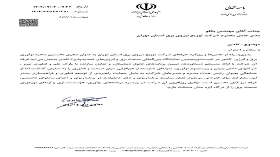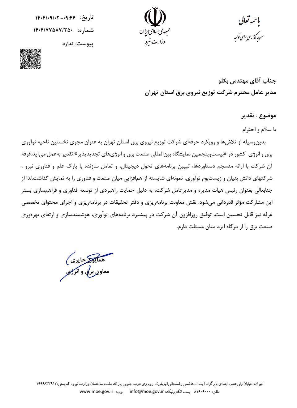 پس از پایان بیست‌وپنجمین نمایشگاه بین‌المللی صنعت برق و انرژی‌های تجدیدپذیر، مهندس همایون حائری، معاون برق و انرژی وزارت نیرو، طی صدور تقدیرنامه‌ای از عملکرد و تلاش‌های شرکت توزیع نیروی برق استان تهران قدردانی کرد.