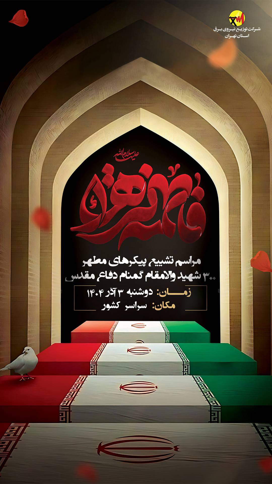 ️به گزارش روابط عمومی شرکت توزیع نیروی برق استان تهران، در این اطلاعیه دعوت آمده است:بسم الله الرحمن الرحیمسالروز شهادت کوثر رسالت، صدیقه طاهره، حضرت فاطمه زهرا (سلامالله علیها)، موعد تجلی حماسه ملی و مکتبی ایران اسلامی و تمثیلی رفیع از پیوند ناگسستنی آرمان دفاع از حریم ولایت با قله شهادت است. حقیقت گمنامی، موهبتی است که در قاموس فرهنگ ایثار، بالاترین معیار منزلت است و ثمره آن، امنیت راهبردی، اقتدار ملی و سکینه کنونی جامعه ایرانی است که جملگی مرهون همت والای شهیدانی است که حیات خویش را فدیه اعتلای نهال انقلاب اسلامی و صیانت از حدود ارزشهای الهی ساختند.در شرایط حساس کنونی که استکبار جهانی و جریانات منطقهای با فتنههای رسانهای و عملیات روانی، در صدد تخریب اراده ملت هستند، شهدا، تذکاری حیاتی به راهبرد اصیل مقاومت و پایداریاند. پیوند روحی شهدای گمنام با مظلومیت شهدای جبهه مقاومت، موید اتحاد مقدس و لزوم استمرار مجاهدت در برابر سیطرهطلبی است و تجدید میثاق با شهدا استحکامبخش عزم ملی برای تحقق افقهای آرمانی نظام خواهد بود.شورای هماهنگی تبلیغات اسلامی، از ملت شریف، آگاه و شهیدپرور ایران اسلامی، دعوت مینماید تا با حضور منسجم در این آیین عظیم، بر استمرار حرکت پر افتخار مقاومت و عزت ملی تأکید ورزند. آیین تشییع 300 شهید گمنام در سراسر کشور و 100 شهید در تهران، صبح روز دوشنبه سوم آذر ماه، رأس ساعت ۸ صبح، از مقابل درب اصلی دانشگاه تهران به سوی معراج شهداء و مراسم شب وداع با پیکرهای مطهر، پیش از تشییع، در محل «موزه انقلاب اسلامی و دفاع مقدس» اجرا خواهد شد.