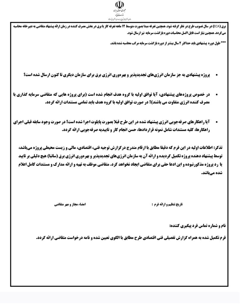 متقاضیان محترم می‌توانند پیشنهادات خود را به صورت مکتوب تا تاریخ 1401/07/30 به آدرس تهران، شهرک قدس انتهای بلوار شهید دادمان جنب بزرگراه یادگار امام (ره)، پژوهشگاه نیرو، ساختمان ساتبا ارسال نمایند.به منظور هماهنگی‌های مربوطه و پاسخ به سوالات درخصوص ساز و کار سرمایه گذاری در بازار بهینه سازی انرژی، متقاضیان می توانند با شماره های 88086145 –021(خانم وثوقی) و 88084686 – 021 (آقای اکبری) تماس حاصل نمایند.همچنین در صورت نیاز به اخذ اطلاعات و مشخصات دقیق تر چراغ ها و معابر استان، نماینده شرکت توزیع نیروی برق استان تهران(آقای محمدی نیا با شماره تماس 09122710043) پاسخگوی متقاضیان خواهند بود.
