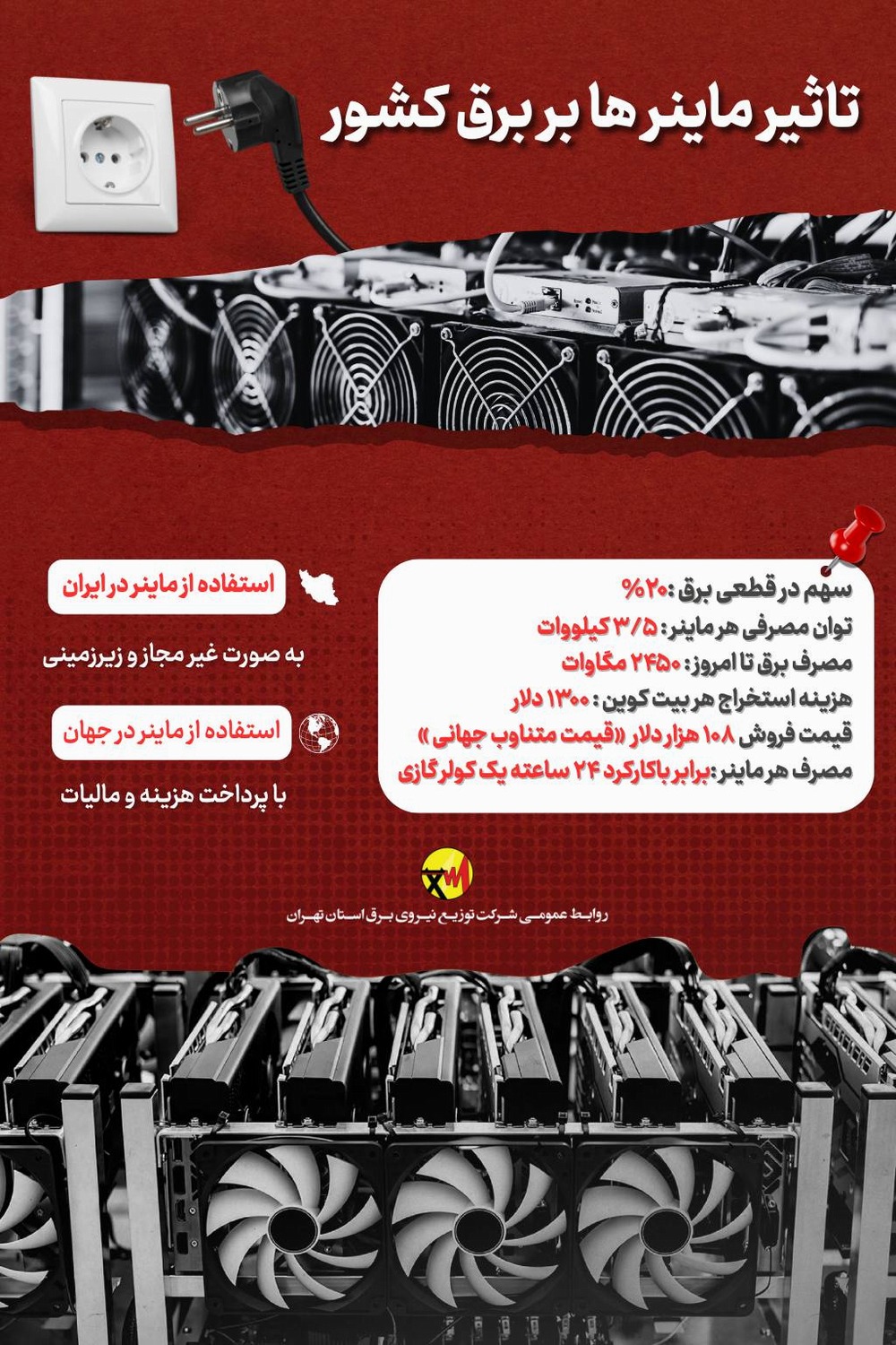 به گزارش روابط عمومی شرکت توزیع نیروی برق استان تهران، این دستگاهها با مصرف سرسامآور انرژی، سالانه هزاران مگاوات برق را میبلعند و فشار قابلتوجهی بر شبکه توزیع برق وارد میکنند. برآوردها نشان میدهد هر دستگاه ماینر، به اندازه یک کولر گازی در شبانهروز برق مصرف میکند و سهم آنها از قطعیهای برق کشور تا ۲۰ درصد تخمین زده میشود.